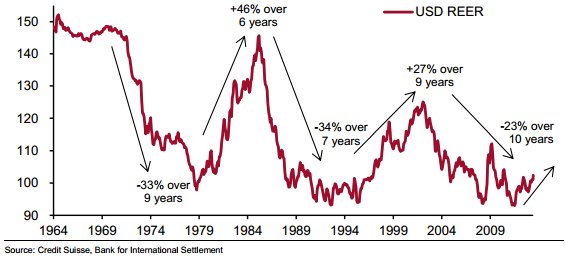 Вот еще график из этой же публикации Кредит Свисс показывает индекс реального обменного курса доллара к валютам странам партнерам. Доллар считается надежной валютой, однако имеет довольно драматическую историю. Прокомментирует основные тренды, что позволит понять сложно проблемы прогнозирования из-за действия многообразия факторов: