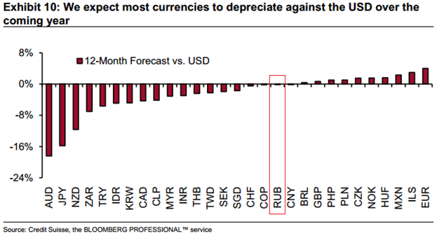Рубль. Рост доллара не означает падение рубля. График ниже из этой же публикации «Кредит Свисс» предоплагает минимальные изменения рубля, однако заметное падение австралийского доллара и йены, и рост евро (тут мы, пожалуй не согласны).