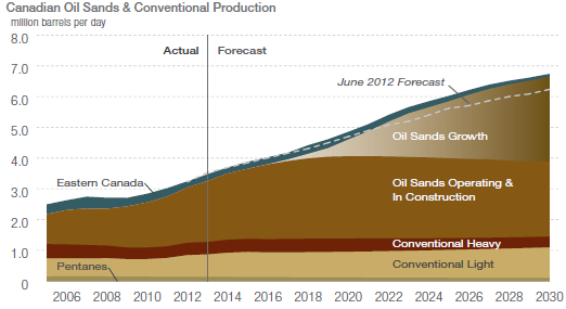 Нефть не упадет? Небольшая иллюстрация, показывающая почему потенциал устойчивогого падения цен на нефть ограничен примерно 60-80/баррель (исходя из того что мы сейчас знаем). Ниже — график из отчета Канадской ассоциации нефтяных производителей, дающей прогноз добычи в стране. Наибольший прирост ожидается от «нетрадиционной нефти», нефтяных песков. С учетом этих запасов Канада находится на третьем месте в мире после Венесуэлы (где также полно тяжелой нефти и Саудовской Аравии).