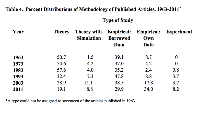 Немного о состоянии экономической науки, порожденной изучением публикаций научных статей по экономике за 60 лет. В последние годы место теоретических иссследований сменили эмпирические, связанные с исследованием данных. Об этом уже отписались Ноа Смит и П. Кругман.