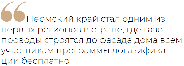 Пермский край стал одним из первых регионов в стране, где газопроводы строятся до фасада дома всем участникам программы догазификации бесплатно. В продолжение этой инициативы было принято решение компенсировать расходы на строительство сетей внутри дома, а также на установку газовой плиты, пункта редуцирования газа, отключающих устройств, приборов учёта газа всем участникам программы. Ранее такая возможность была только у отдельных категорий граждан. В ближайшие три года на компенсацию этих расходов из бюджета Пермского края направят 900 млн руб.