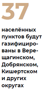Как рассказал губернатор, в этом году компания завершила в Пермском крае строительно-монтажные работы по пяти межпоселковым газопроводам к 22 деревням и сёлам Карагайского, Кишертского, Очёрского и Чайковского округов. Это позволит в дальнейшем обеспечить газом более 1,8 тыс. домовладений и 12 котельных.