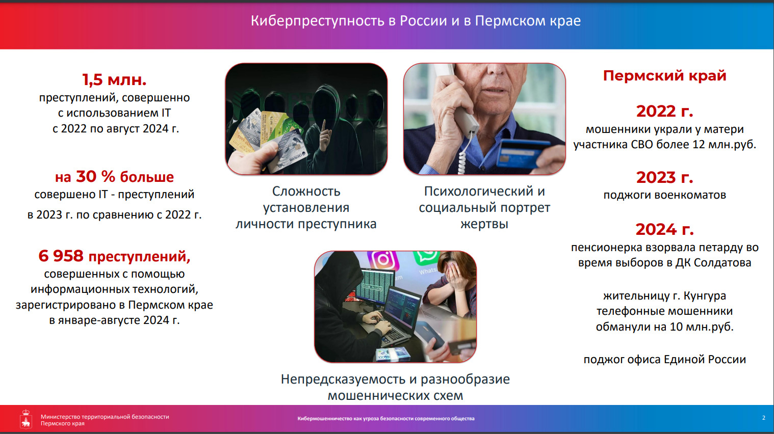 «Не секрет, что угрозы в сфере кибермошенничества чаще всего исходят из недружественных стран. В последние годы правоохранительные органы отмечают значительный рост числа преступлений в этой области, а также, к сожалению, увеличение размера ущерба от них, — комментирует Альберт Марданов, первый замминистра территориальной безопасности Пермского края. — С 2022 года по август 2024-го было зарегистрировано около 1,5 млн киберпреступлений. А за последние три года мошенники похитили у россиян более 350 млрд руб. Представьте, какая это огромная сумма! Это больше, чем годовой бюджет Пермского края!».