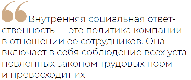 Внутренняя социальная ответственность — это политика компании в отношении её сотрудников. Она включает в себя соблюдение всех установленных законом трудовых норм и превосходит их.