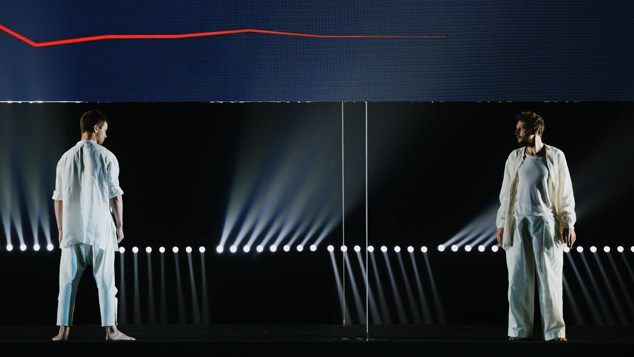 В этой предельной ситуации неизбежны религиозные ассоциации и подтексты, и постановщики их чувствуют: герои как будто вознесены над повседневностью, они в горней выси на верхнем ярусе сцены, буквально под небом, только не голубым, а белёсым, морозным, подёрнутым причудливыми сполохами — то ли северного сияния, то ли замёрзшей на лету метели; одеты они в белое, словно ангелы, а может, на героях саваны — ведь ясно, что выжить здесь не судьба. Движутся эти герои тоже не вполне буквально: обычные человеческие действия переведены здесь в почти танцевальный язык (хореограф Дамир Сайранов), в котором движение то и дело замирает, как будто герой готовится воспарить.