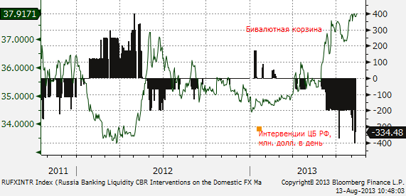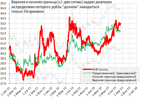 Рубль по-прежнему остается на рекордных минимумах к бивалютной корзине, а Центробанк наращивает объемы интервенций в поддержку рубля. При этом Брент не дешев - на $109/баррель. Разбег между предсказаниями нашей модели (32.16 руб./$) и текущим курсом (33 руб./$) составляет 2.6%. Мы по-прежнему ждем небольшого укрепления, а текущая динамика может объясняться сезонными факторами. Похоже, что рубль дешев в конце лета и осенью и дорожает ближе к концу года и в январе-феврале.