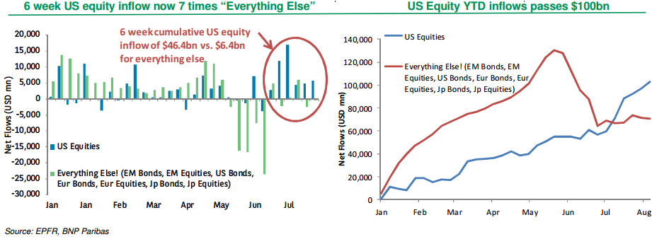 Интересно, что “ротация” касается преимущественно американских акций, если верить статистике притоков-оттоков EPFR во взаимные фонды. С начала года фонды, связанные с американским рынком, получили $100 млрд.