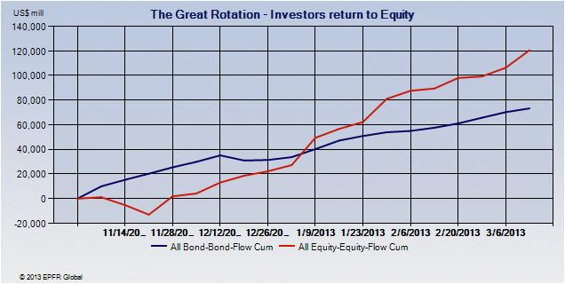 Ротация. FTAlphaville дает описание, как идет процесс “большой ротации”. Напомним, что это ожидавшийся процесс притока капиталов на рынки акций с рынков облигаций по мере выхода из кризиса и нормализации ставок.
