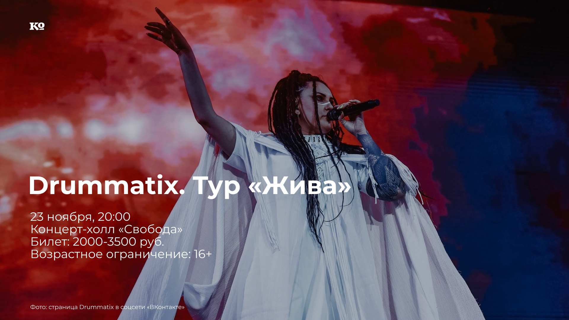 Drummatix — омская исполнительница, которая быстро завоевала популярность одновременно на российской хип-хоп, этно и альтернативной сцене. Как такое возможно? Всё дело в том, что её песни находятся в диапазоне от шаманского хип-хопа до этно, от сочных битов до пронзительной лирики. Это невозможно описать одним словом, это можно только почувствовать. Сейчас у Drummatix — вторая часть тура по родным краям и новым землям. Продолжением тура станет большое путешествие от северо-запада страны до Сибири в поддержку альбома «Жива». В рамках тура певица порадует поклонников треками и эксклюзивным драм-шоу. Это будет уже полюбившаяся слушателям гремучая смесь из фастфлоу с налётом хардкора и этно. Концерт Drummatix — это увлекательное путешествие от медитаций до первобытных танцев, ритмы которых уносят в первозданное состояние.