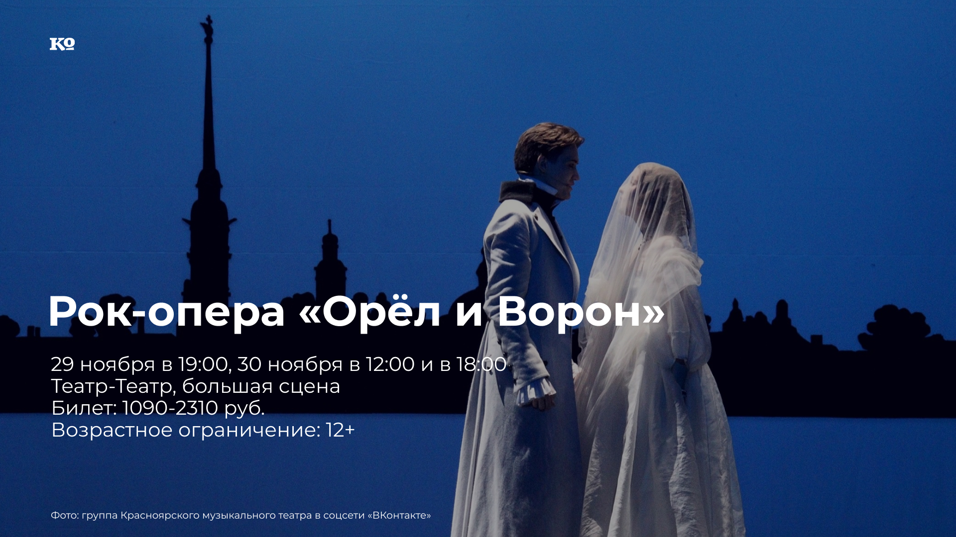 Артисты Красноярского музыкального театра приедут с гастролями в Пермь и исполнят на большой сцене ТТ рок-оперу «Орёл и Ворон» по мотивам «Капитанской дочки» Александра Пушкина. Это современный взгляд на историю становления личности. Все герои сюжета, разворачивающегося на сцене, сталкиваются на своём пути с выбором. Но только Пётр Гринёв и Маша Миронова меняются, они вырастают, в них крепнет способность нести ответственность за свою жизнь и любовь. Спектакль является трёхкратным лауреатом премии «Золотая маска» 2024 года.