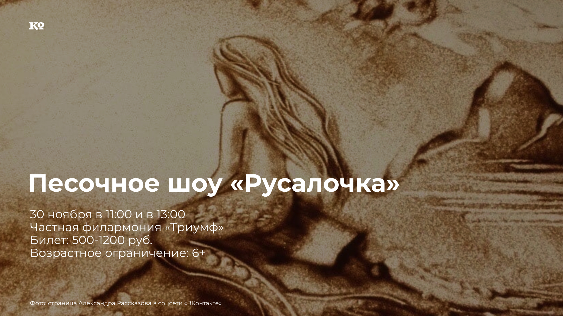 Зрители станут свидетелями волшебства миллиарда песчинок, оживлённых фантазией художника, которые расскажут чудесную сказку «Русалочка». В шоу примут участие мастер песочной анимации, художница, финалистка международного конкурса Sand Malerei Festival (Гамбург, 2016 год) Елена Кадырова и солист Уральского государственного театра эстрады, лидер группы «Красная скрипка» Александр Рассказов. Загадочные образы героев, созданные на световом столе, будут транслироваться на большой экран, взмахи руки художника будут заряжать песчинки энергией, оживляя изображения, а живая музыка позволит тонко чувствовать настроения сказочных героев.