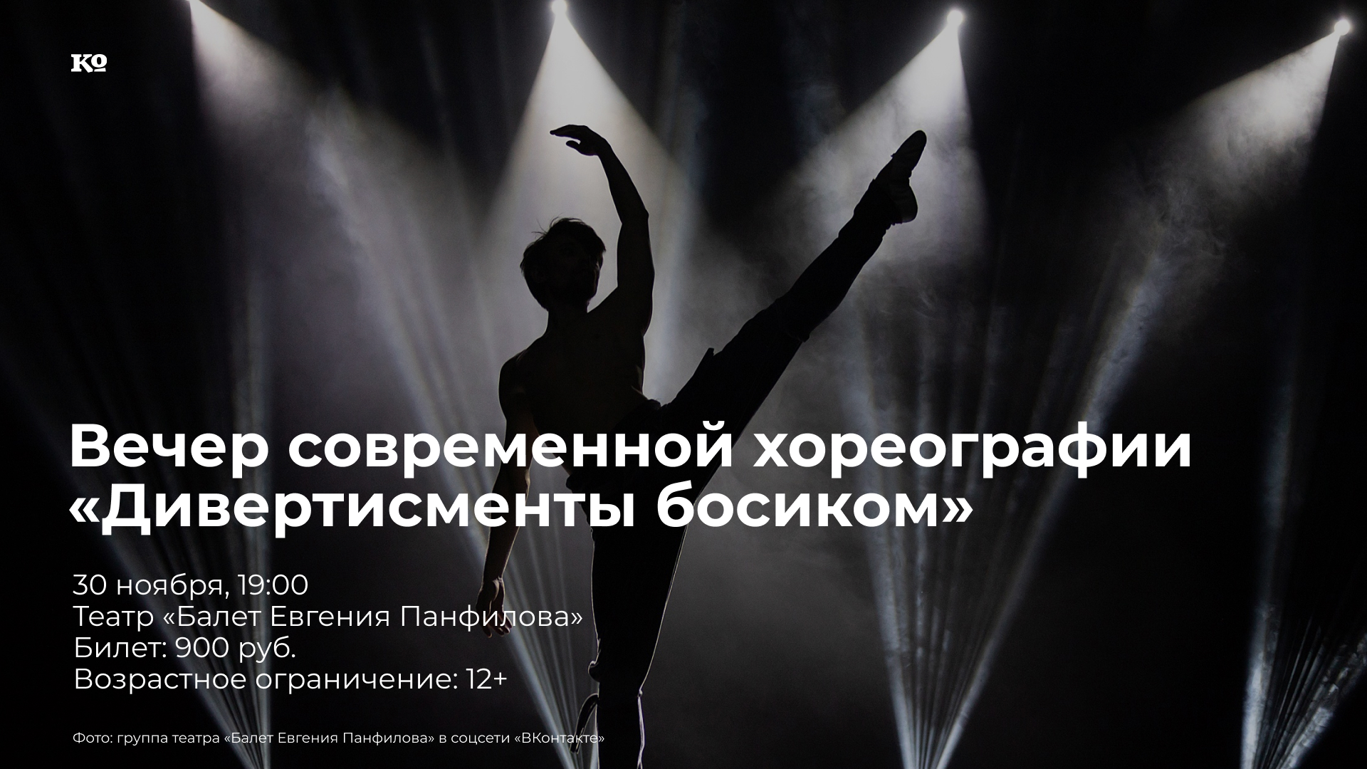 Divertissement можно буквально перевести с французского как «развлечение» или «увеселение». Так называют балетный спектакль, состоящий из отдельных номеров, не связанных между собой. «Балет Евгения Панфилова» подготовил уже вторую программу современной хореографии, объединённую под общим названием «Дивертисменты босиком» (первая была показана в 2020 году), которая собрана из миниатюр и фрагментов лучших спектаклей театра последних лет. В новую программу вошли номера, поставленные для фестивалей и конкурсов, — «Мой милый Сердан», «Кукла» и другие, а также фрагменты из таких спектаклей, как «Жажда жизни» и «Звезда 62090» в хореографии Сергея Райника и Алексея Расторгуева. Босая нога — как особый символ и отличительный знак современного танца. Все номера вечера будут исполнены босиком.