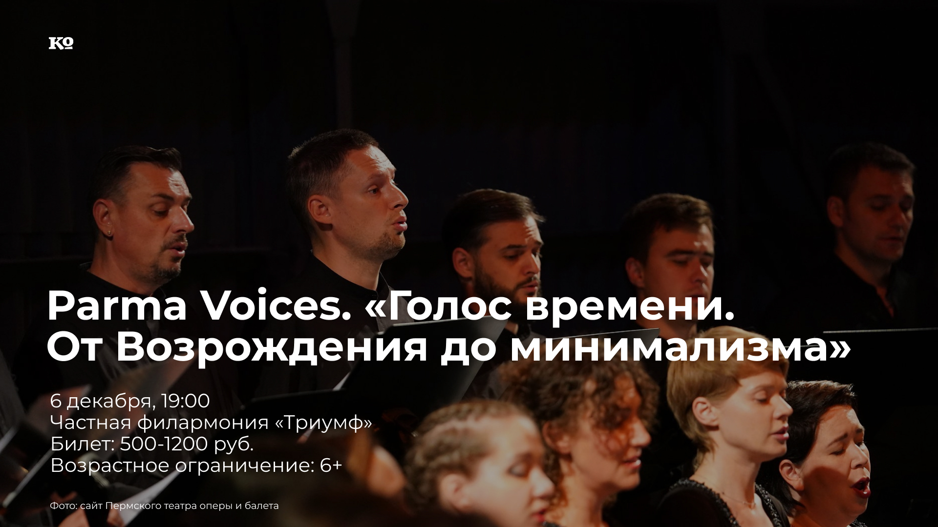 Хор Parma Voices под руководством хормейстера Даниила Журилова представит на сцене «Триумфа» новую программу — концерт-инсталляцию «Голос времени. От Возрождения до минимализма». Прозвучит российская премьера сочинения Дэна Форреста The Sun Never Says, а также Da pacem Domine Арво Пярта, Funeral Canticle Джона Тавенера, Lux Aurumque Эрика Уитакра, произведения Альфреда Шнитке, Джакомо Кариссими, Антона Брукнера, Эдуарда Элгара и других композиторов.