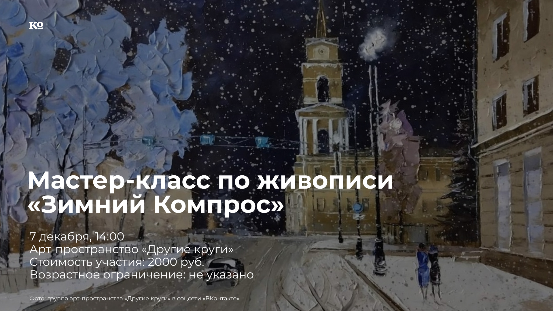 В арт-пространстве «Другие круги» начинается предновогодний марафон мастер-классов. Откроет его пермский художник Дмитрий Козлов. На своих полотнах он любит изображать городскую среду — улочки, архитектуру, атмосферу. Гости «Других кругов» уже писали вместе с художником яркий летний город и меланхоличную осеннюю Пермь. В этот раз участники мастер-класса постараются передать настроение зимы: глядя на работу можно будет почувствовать, как падает и приятно хрустит под ногами снег, увидеть яркие огни украшенных улиц, ощутить приближение Нового года, запах мандаринов и детский восторг от грядущего волшебства. В качестве основного инструмента для создания картин будут использовать мастихин — так работы получатся более объёмными и красочными. Записаться на мастер-класс можно через личные сообщения группы арт-пространства ВКонтакте.
