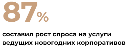 Спрос на аренду площадок вырос на 144% по сравнению с прошлым годом. Стоимость в среднем по городу начинается от 1,3 тыс. руб. в час и зависит от местоположения, размера, декора и количества посадочных мест в помещении. Повысился и интерес к услугам оформления площадок (+26%), костюмированным представлениям с участием Деда Мороза и Снегурочки (+80%).