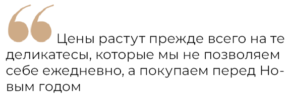 «Вообще, рост цен стимулируем мы сами, потребители. Потому что продуктовый набор, который мы из года в год с небольшими изменениями используем для новогоднего стола, дорожает просто из-за роста спроса на него. То есть цены растут прежде всего на те деликатесы, которые мы не позволяем себе ежедневно, а покупаем перед Новым годом», — подчеркнула эксперт.
