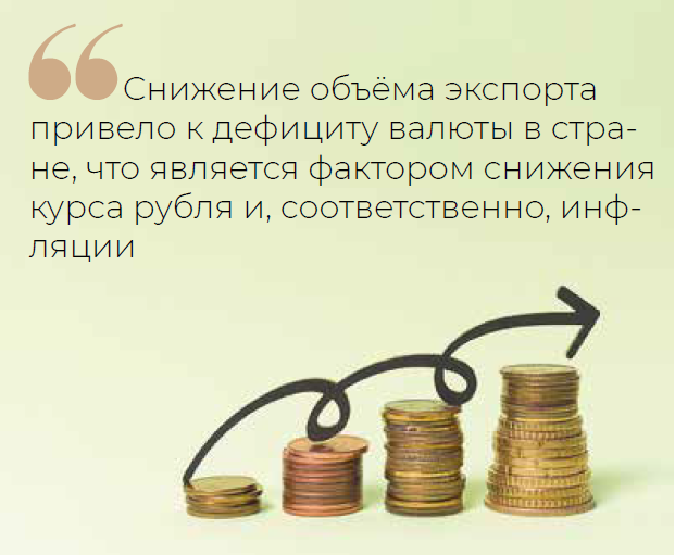 Также проинфляционным фактором является ситуация с экспортом. В последние годы экспорт находится под серьёзным санкционным давлением, ограничивающим его объём. Свою роль играет конъюнктура на международном нефтяном рынке, поскольку нефть остаётся основным экспортным товаром России. Здесь действуют несколько факторов: замедление китайской экономики, из-за чего снижается спрос на нефть, энергопереход, а также давление ОПЕК+. Снижение объёма экспорта привело к дефициту валюты в стране, что является фактором снижения курса рубля и, соответственно, инфляции. По мнению Кирилла Тремасова, задачей Министерства экономического развития России является расширение экспортных рынков. Это способствовало бы притоку валюты в страну.