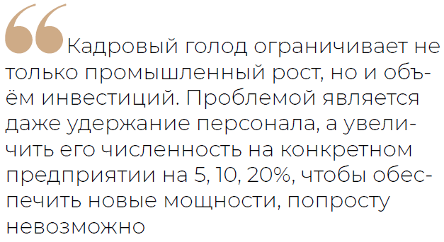 Он констатировал, что кадровый голод ограничивает не только промышленный рост, но и объём инвестиций. Проблемой является даже удержание персонала, а увеличить его численность на конкретном предприятии на 5, 10, 20%, чтобы обеспечить новые мощности, попросту невозможно.