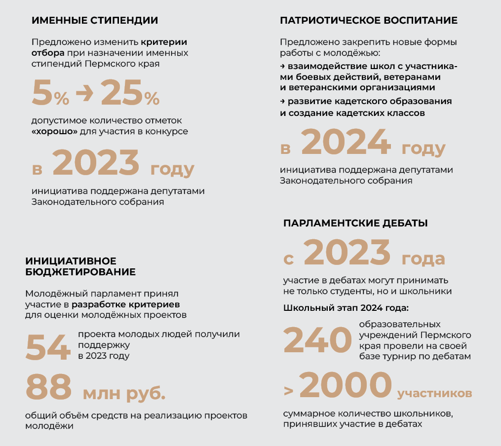 В целом за весь период работы шестого состава были подготовлены поправки в пять региональных и федеральных законов. Молодёжный парламент также стал соавтором изменений в механизме инициативного бюджетирования, в котором в 2023 году появилось отдельное направление для молодёжи.