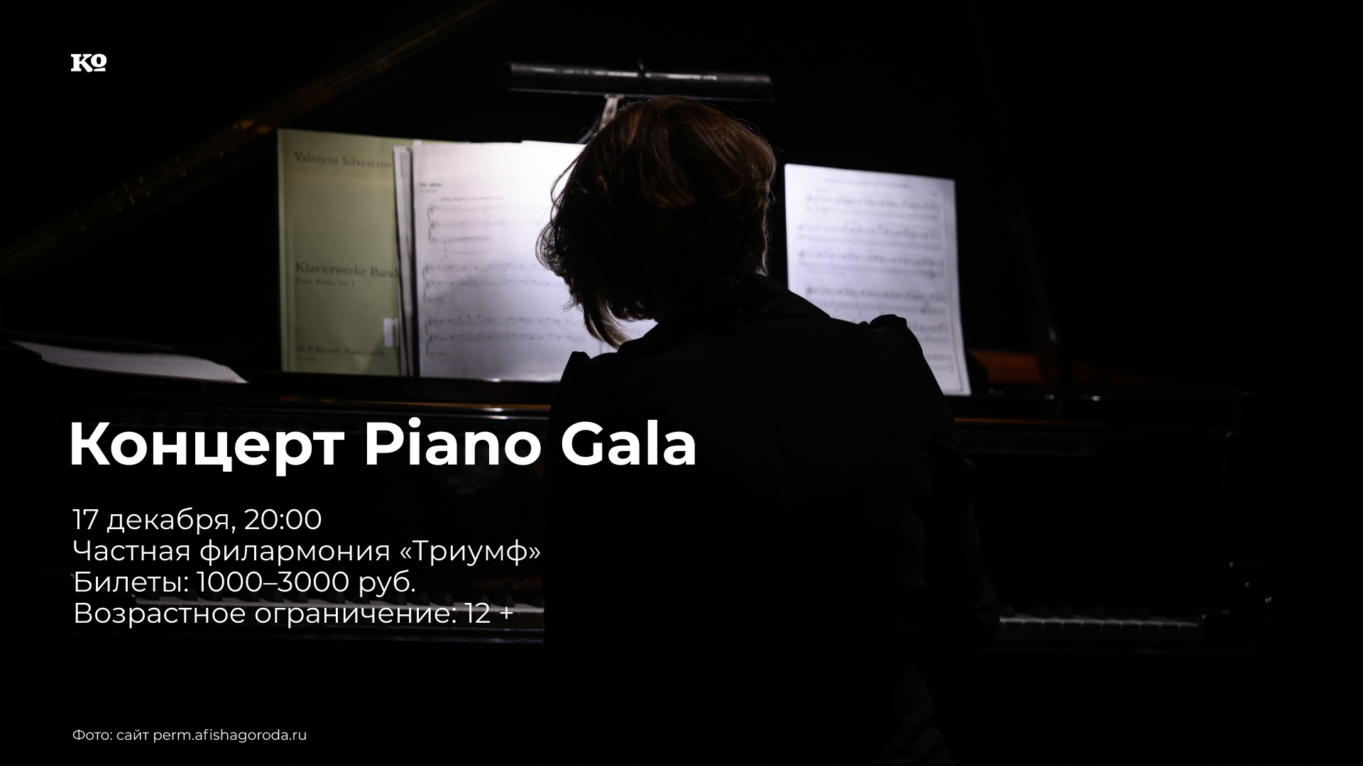 Piano Gala — цикл сольных фортепианных концертов практически в полной темноте, лишь один-единственный луч софита — на рояль и на парящие над клавишами руки пианиста. Зрители могут располагаться на пуфиках и подушках почти у самого рояля, а также на обычных зрительских местах. Концерт посвящён новогодней и рождественской музыке. В первом отделении прозвучат произведения Иоганна Себастьяна Баха, в том числе транскрипции самых популярных хоральных прелюдий, рождественской оратории и знаменитой скрипичной чаконы. Во втором отделении будет исполняться оркестровая музыка Петра Ильича Чайковского в переложениях для фортепиано: сюита из балета «Щелкунчик» и скерцо из Симфонии № 6.