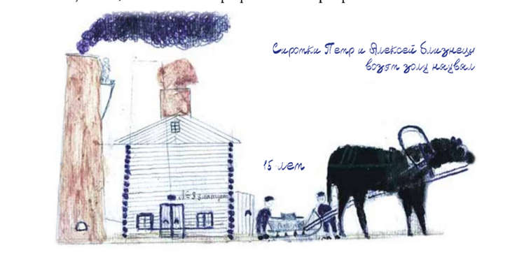 Рисовать Пётр Петрович, понятное дело, тоже не был обучен, однако отважно брался иллюстрировать свои рассказы: изображать строения, людей и животных, которых он очень любил. Его лошадки и коровы — это чистое умиление. Несмотря на наивность этой графики, в ней множество подробностей того, как были устроены соляные промыслы, вплоть до количества ступеней, по которым соленос должен был подняться в амбар с мешком на плечах.