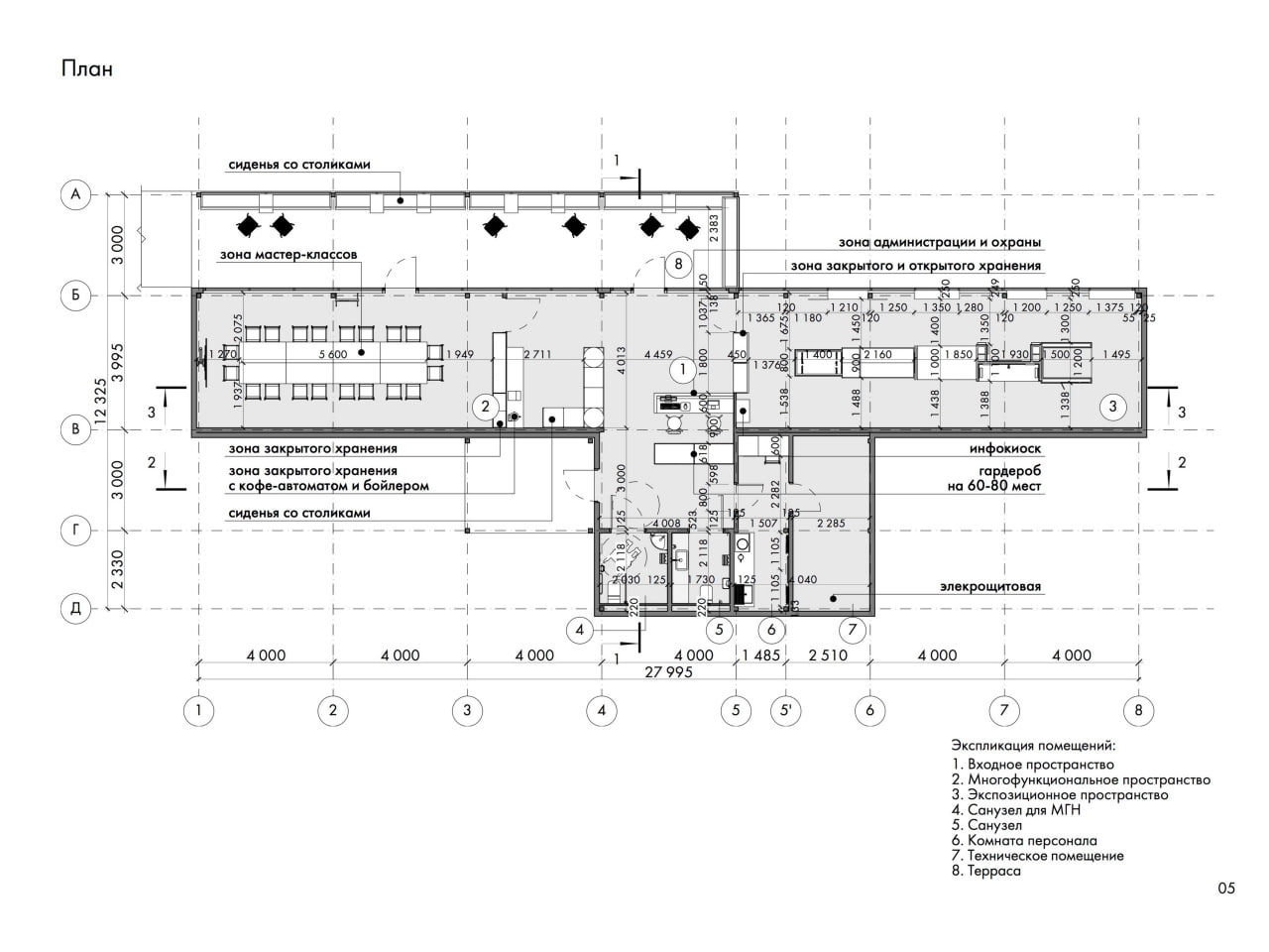 Архитектура многофункционального пространства разрабатывалась с учётом того, чтобы разместить автобус школьников или туристов — группу в 45-50 человек, поэтому предусмотрена система трансформируемых столов с разными вариантами расстановки.
