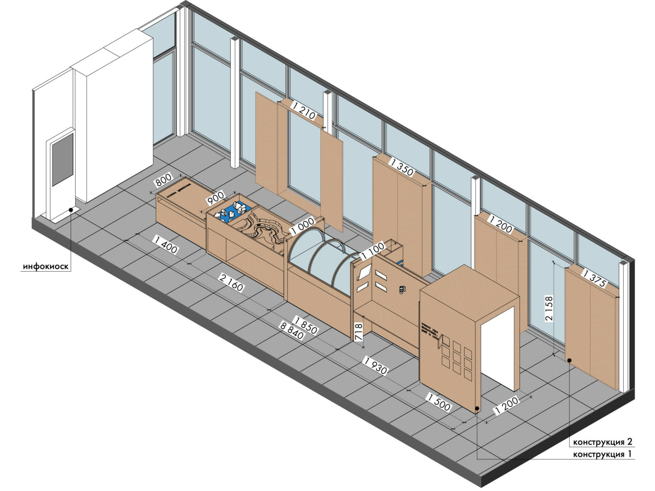 Во входной зоне предполагается разместить информационную стойку, стойку для сувениров, небольшое кафе, комнату для сотрудников и туалетные комнаты.