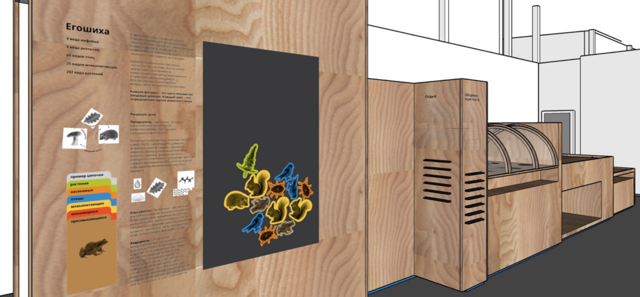 Мы понимали, что невозможно включить весь пласт информации в экспозиционную часть визит-центра, поэтому в этот небольшой зал мы заложили решения, которые позволяют при модульном гибком оборудовании периодически менять содержание. Мы не могли использовать фондовые коллекции и решили вообще не использовать таксидермические материалы или что-то, что могло бы напоминать стандартный музей. Мы предлагаем много интерактивных моментов, которые дают точки отсчёта, и дальше, уже выходя за пределы визит-центра, можно то или иное явление, на которое мы обращаем внимание тезисно, исследовать уже в долине реки.