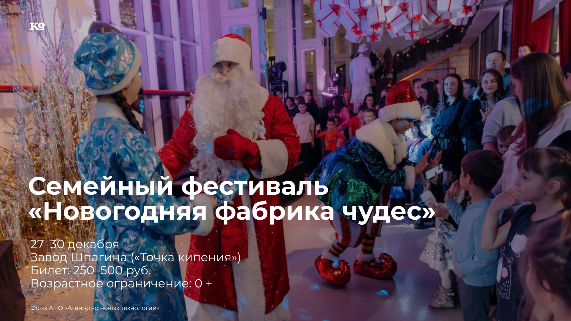 Фестиваль займёт всё пространство здания и будет проходить в формате иммерсивного театрального действия с участием артистов разных жанров. Слоган события — «Чудеса не за горами». В программе «Новогодней фабрики чудес» — парад Дедов Морозов, магов и фей, измеритель уровня волшебства, экспериментальный театр магов, музыкальные костюмированные перформансы, новогодние гадания на тортах и кофейной гуще, «Лавка чудес», аллея Времени, карусель перемен, чемпионат по поеданию конфет и многое другое. Запланированы театральные представления, мастер-классы и другие обучающие события. Будет работать «Почта Деда Мороза», большая ярмарка и фудкорт.