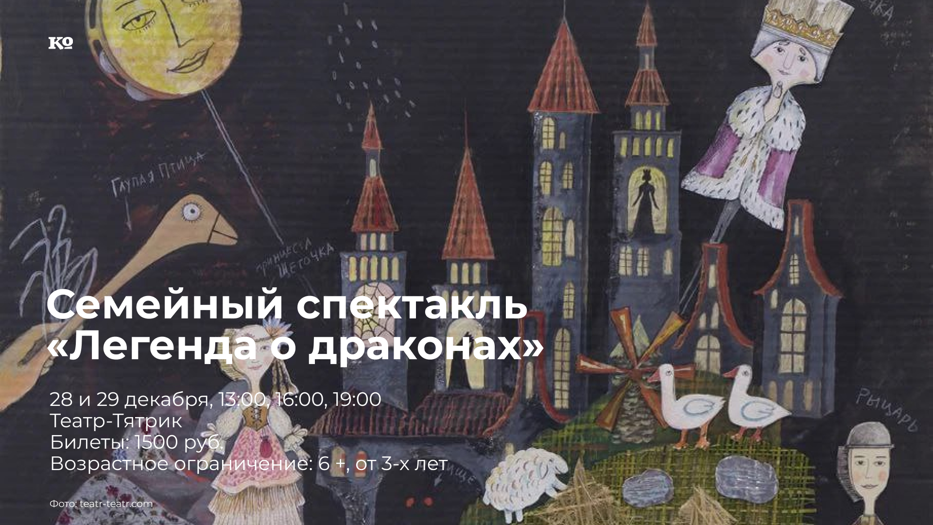 «Легенда о драконах» – это история о дружбе драконов и людей, о прекрасной принцессе, о короле и, конечно, об отважном герое с храбрым сердцем. В этом спектакле предметы, которые есть в каждом доме, превращаются в театральные куклы. И самые обычные, на первый взгляд, вещи становятся героями сказки. Гостиная заботливой тетушки Эльзы оживёт, и мы перенесемся в эпоху Средневековья. Узнаем настоящую легенду о тайнах драконов и магии тех мест, где они живут. Спектакль пробудит воображение и откроет новые грани привычных вещей. «Легенда о драконах» — это формат семейного театра, куда дети приходят с родителями, вместе переживают события, а потом полученный опыт уносят с собой.