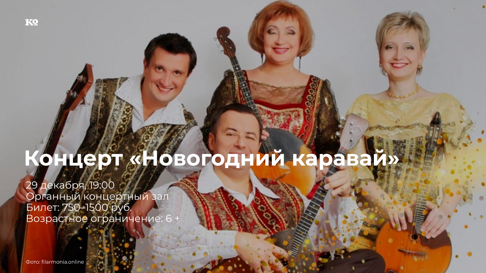 Предновогодний концерт квартета народных инструментов «Каравай» – столь же нерушимая пермская традиция, как новогодний «Щелкунчик», и такая же любимая. Ансамбль солистов Пермской краевой филармонии «Каравай» во главе с Олегом Згогуриным, а также пианистка Гульназ Гарипова, певец Владимир Чадов и ударник Сергей Казанцев исполнят легендарные зиты классической советской и зарубежной эстрады, такие как попурри на темы «Биттлз», «Джамайка» и «Шизгара», Let It Snow!; «Ты говоришь мне о любви» и «Бежит река» Эдуарда Колмановского, «А снег идёт» Андрея Эшпая и другие. «Квартет Каравай» — один из лучших инструментальных квартетов России, обладатель Серебряной медали «Национальное достояние», лауреат премии Пермского края в сфере искусства и культуры.