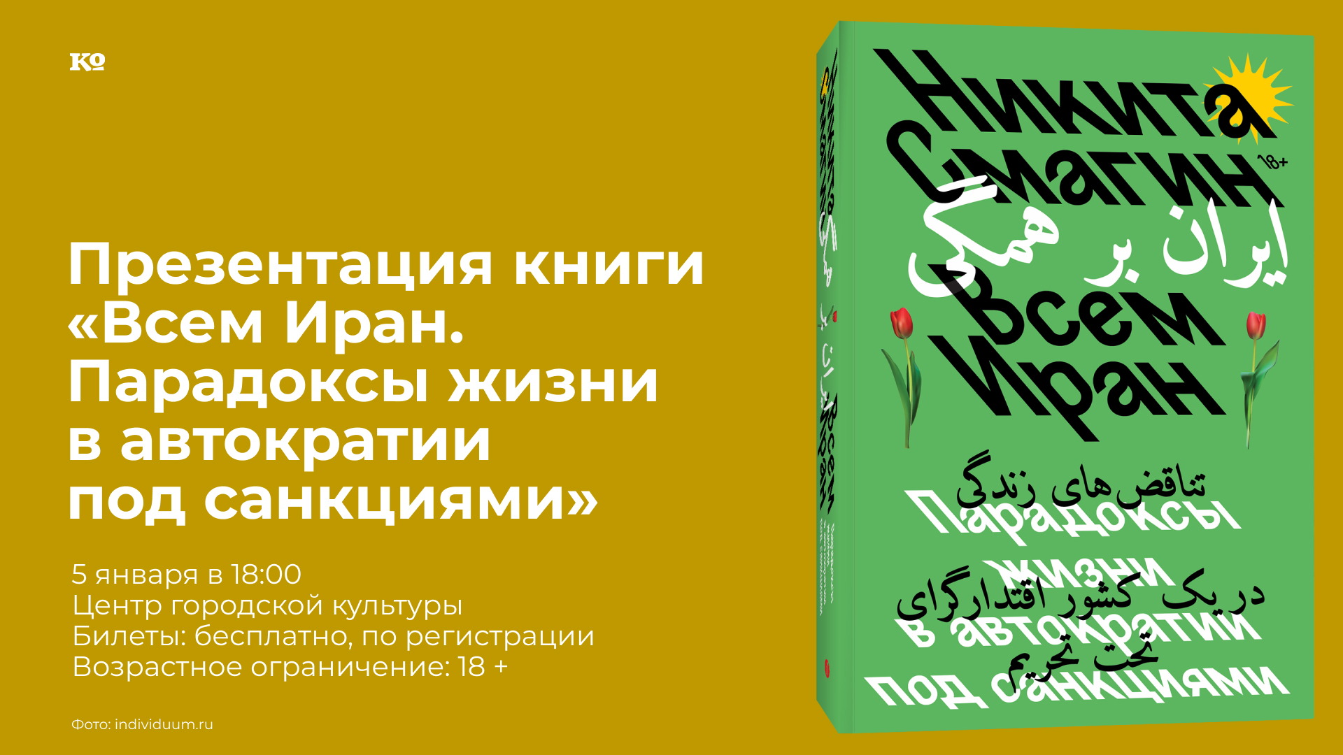 Независимый книжный магазин Пиотровский проведёт презентацию новой книги издательства Individuum и встречу с её автором. Журналист и политический аналитик Никита Смагин прожил в Иране несколько лет и написал книгу «Всем Иран. Парадоксы жизни в автократии под санкциями» (18 +). Это история о стране, правительство которой видит корень мирового зла в США и вооружается до зубов для противостояния коварным внешним врагам, внутри границ жестоко преследует инакомыслящих, а выше семейных ценностей ставит только религиозные табу. Но также «Всем Иран» — о людях, которые знают, где выгодно купить новый айфон, ходят в подпольные клубы на рейвы и всегда нальют дорогому гостю чаю из самовара. Никита Смагин расскажет о работе над книгой и парадоксальной иранской действительности, а также даст пару советов, как не попасть впросак иностранцу в Иране.