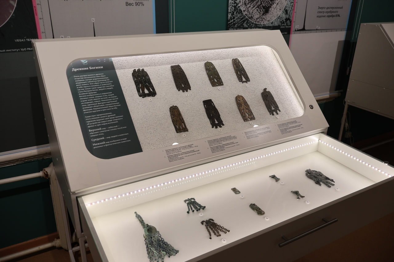 Если вы не были в Чердынском музее хотя бы год, то вас ждёт много нового: экспозиция в двух основных зданиях полностью изменилась. В женской гимназии открылся большой зал, посвящённый ископаемым сокровищам — пермскому звериному стилю и сасанидскому серебру. Это долгожданная экспозиция (0+), и она, конечно, радует многим: здесь можно увидеть знаменитых «тимшерских богинь» — самые загадочные и самые совершенные по технике исполнения предметы пермского звериного стиля; вернулась из запасников и «Редикорская принцесса», правда, если раньше, в историческом здании музея, захоронение демонстрировалось целиком (трогательный скелетик в торжественном убранстве), то нынче музейными правилами человеческие останки показывать запрещено, и в витрине — только украшения.