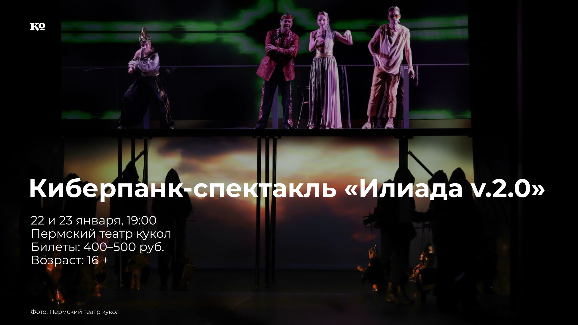 Премьера! В этом спектакле живые артисты, куклы-марионетки и видеоэкраны участвуют в едином действии, а сюжет поэмы Гомера сочетается с Вселенной Виктора Пелевина. Зевс носит галстук-бабочку, Гермес — девушка в спортивном костюме и кроссовках, Аполлон покрыт глиттером… Режиссёр Дмитрий Вихрецкий и художник Виктория Ельцова привнесли в образы древнегреческих богов элементы современной массовой культуры. Небожители разговаривают на современном языке, используют компьютерный сленг и даже читают рэп. Остроумный авторский текст, сочетающий эпический гекзаметр, народную песню, отсылки к Мандельштаму и Бродскому, написан драматургом Сергеем Плотовым. Сюжет выстроен вокруг нескольких эпизодов Троянской войны. Кровопролитный конфликт затеян богами для развлечения: глядя, как погибают люди, они пытаются развеять скуку.