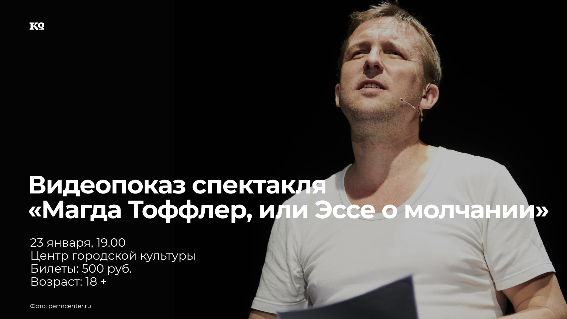 Показ записи спектакля швейцарского режиссера Бориса Никитина «Магда Тоффлер, или Эссе о молчании» (2022) на немецком языке с русскоязычными субтитрами. На пустой сцене в круге света — стул. Человек в чёрных джинсах и белой рубашке сядет на стул и станет читать текст, бросая листы с прочитанным на пол. Вот и вся мизансцена. Человек в черных джинсах и белой рубашке — швейцарский режиссер и драматург Борис Никитин. Пять лет назад он выпустил спектакль об отце — «Эссе об умирании». «Эссе о молчании» представляет собой вторую, женскую часть диптиха — о Магде Тоффлер, бабушке режиссёра. Никитин уподобляет эти исповедальные спектакли каминг-ауту: они становятся для режиссера способом говорить не только о личной жизни, но и о личных сомнениях относительно того, насколько можно доверять «свидетелю» документального театра, человеку, выступающему на сцене в качестве живого эгодокумента.