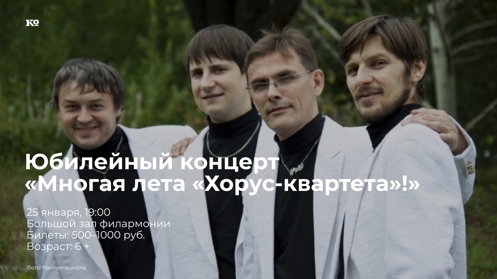 Вокальный «Хорус-квартет» отмечает юбилей — четверть века. В большом концерте кроме коллектива-юбиляра примут участие друзья: эстрадно-симфонический оркестр под управлением Вячеслава Панова, хореографическая студия гимназии им. С. П. Дягилева «Вдохновение», пианистка Гульназ Гарипова и аккордеонист Александр Прокопчук. В программе — песни классической советской и зарубежной эстрады, музыка пермских композиторов. Четверо профессиональных певцов создали «Хорус-квартет» в 1999 году. В основе их творчества — традиции ансамблевого пения, присущие русской певческой школе ещё с XVI века. За 25 лет изменился состав коллектива, но бессменным остаётся его руководитель Александр Рогожкин. Сегодня вместе с ним поют Максим Лаптев (тенор), Максим Ануфриев (баритон) и Эдуард Морозов (бас).