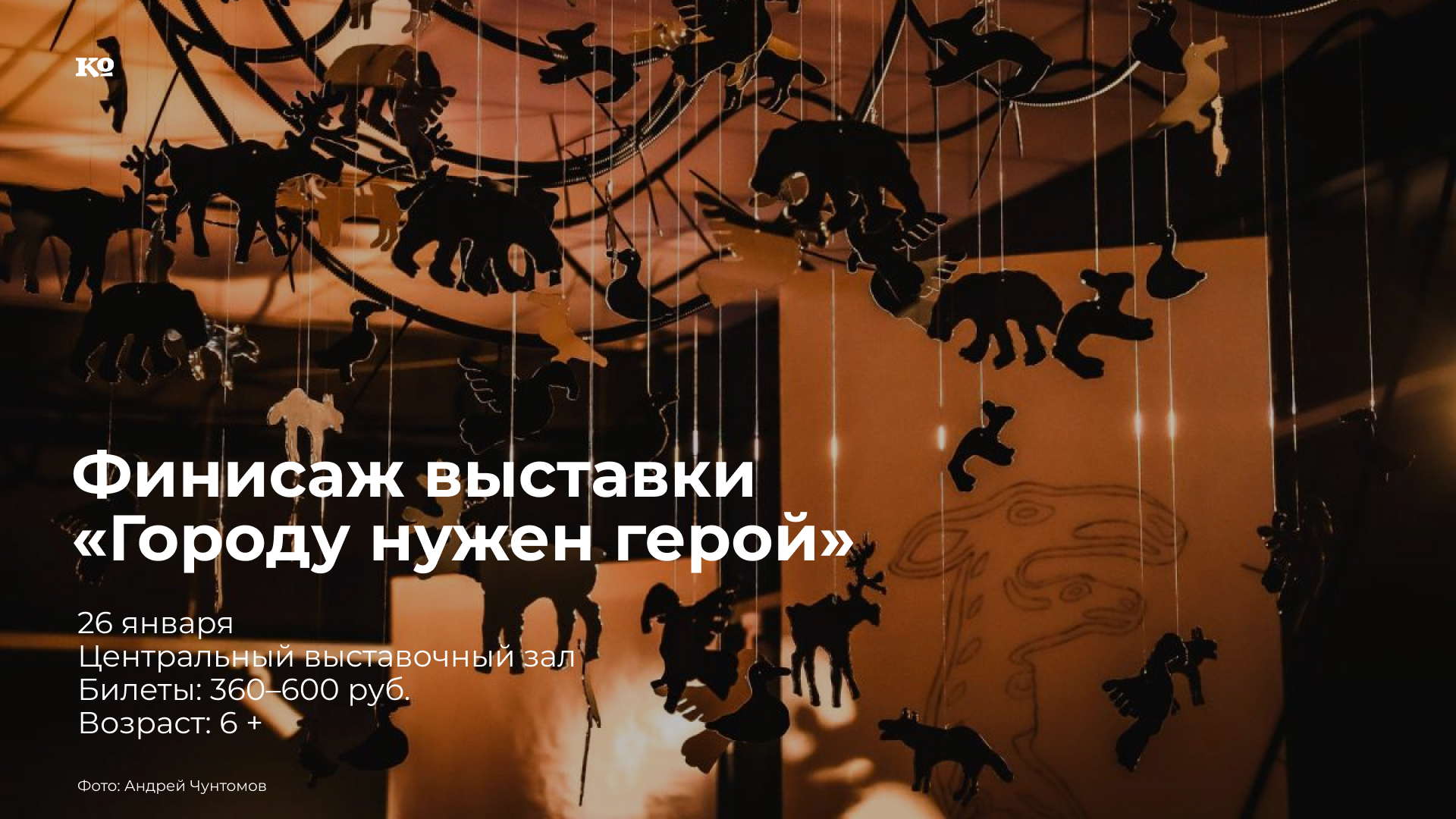 В Центральном выставочном зале последние дни работает выставка о пермском зверином стиле «Городу нужен герой». 26 января состоится финисаж, на котором пройдёт розыгрыш сувениров — зеркальных копий силуэтов животных с подвески-медальона IX-X вв. из Чердынского краеведческого музея, которые были использованы для оформления выставочного пространства. Каждый посетитель, купивший билет, сможет испытать удачу и вытянуть листок с призом. До 26 января включительно на выставке будут проходить экскурсии для сборных и семейных групп. Экскурсии состоятся 25 января в 13:00, 15:00 и 17:00, 26 января в 13:00, 15:00 и 17:00. Кроме того, 26 января в 12:00 и 14:00 пройдут специальные детские экскурсии «Тайны пермского звериного стиля».
