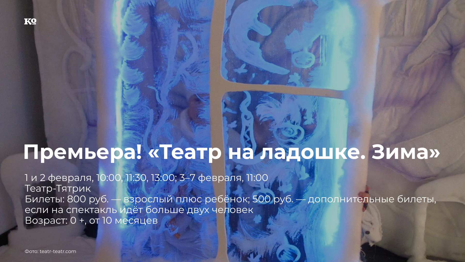 «Театр на ладошке» — проект о временах года, созданный основателями Первого театра (Москва) Юрием и Ольгой Устюговыми. Пришла зима, можно лепить снеговиков, кататься на санках и играть в снежки! Расположившись на мягких подушках прямо на сцене камерного зала Театра-Тятрика, дети вместе с родителями окажутся в атмосфере зимних чудес: мышка торопится собрать орехи для своих малышей, маленькие фигуристы покоряют каток, а потом начинается настоящая метель из перьев. В финале детей ждут приятные подарки — игрушечные мышки. Зрители спектакля размещаются на ковре и мягких подушках, поэтому перед входом в зрительный зал детям и родителям необходимо будет снять уличную обувь. Рекомендуется взять с собой сменную обувь или дополнительные носочки.