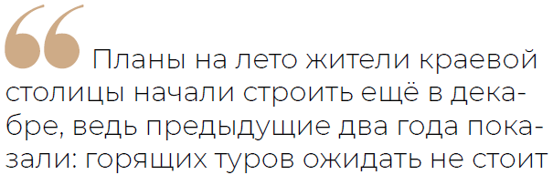 Планы на лето жители краевой столицы начали строить ещё в декабре, ведь предыдущие два года показали: горящих туров ожидать не стоит, отмечает заместитель директора турагентства «Финист» Екатерина Ипполитова. К тому же туристы берут в расчёт и то, что ближе к сезону цены вырастут на 30–40%, а туры во многие популярные отели к началу сезона и вовсе будут полностью распроданы.