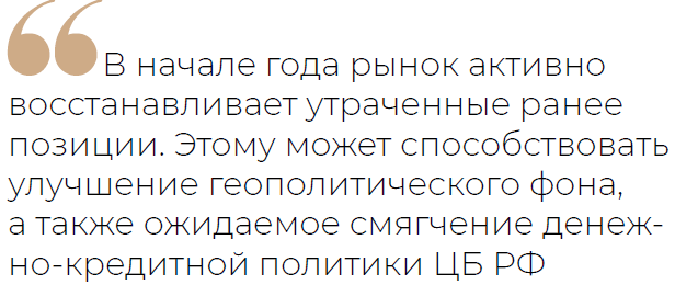 «Российский рынок ни разу в истории не падал два года подряд. Вероятно, этот год не будет исключением. В начале года рынок активно восстанавливает утраченные ранее позиции, ожидаем продолжение восстановительной динамики. Этому может способствовать улучшение геополитического фона, а также ожидаемое смягчение денежно-кредитной политики ЦБ РФ», — говорит Олег Решетников.