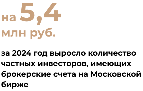 Кроме того, в 2024 году количество частных инвесторов, имеющих брокерские счета на Московской бирже, увеличилось на 5,4 млн и достигло 35,1 млн, ими открыто более 64,3 млн счетов (+12 млн за 2024 год). Число активных инвесторов, то есть заключавших сделки в течение года, составило 10,2 млн человек по сравнению с 7,6 млн в 2023 году. Также выросло количество IPO: их было 14, и, по данным «Известий», это рекордный показатель за последние 17 лет.