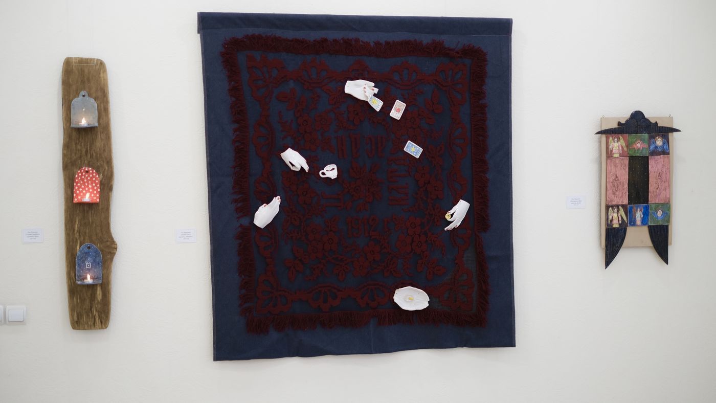 Ева Нурулина превращает старинную ажурную шаль с крупными инициалами владелицы в скатерть, на которой фарфоровые руки раскладывают для гадания фарфоровые карты. Композиция называется «Новый 1912-й»: