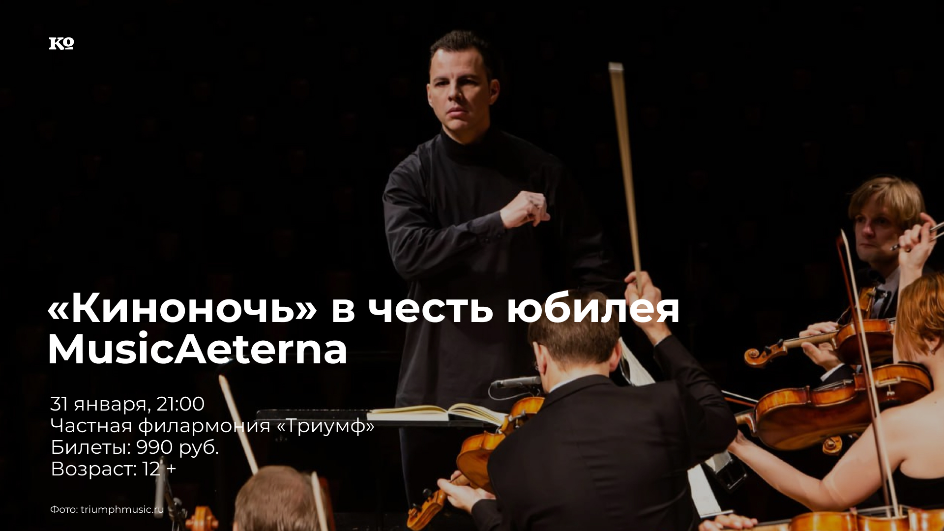 31 января 2005 года состоялся первый концерт молодого оркестра, собранного в Новосибирске Теодором Курентзисом и получившего название Musica Aeterna — «Вечная музыка». В этом году оркестру исполняется 20 лет, из которых восемь — с 2011 по 2019-й — он провёл в качестве коллектива-резидента Пермского театра оперы и балета. В честь своего юбилея оркестр проведёт для пермских поклонников специальное событие — «Киноночь» в частной филармонии «Триумф». На видеомарафоне «Ночь MusicAeterna в кино» меломаны смогут встретиться с артистами оркестра Еленой Райс и Марией Зоркиной, а также с новым главным хормейстером Пермского театра оперы и балета Валерией Сафоновой и посмотреть три эпохальные видеозаписи: «Реквием Моцарта», снятый на Зальцбургском фестивале; атмосферную запись в древнем дельфийском амфитеатре «Курентзис и Саша Вальц: Бетховен, Симфония № 7» и грандиозный концерт «Курентзис: Малер, Симфония № 5».