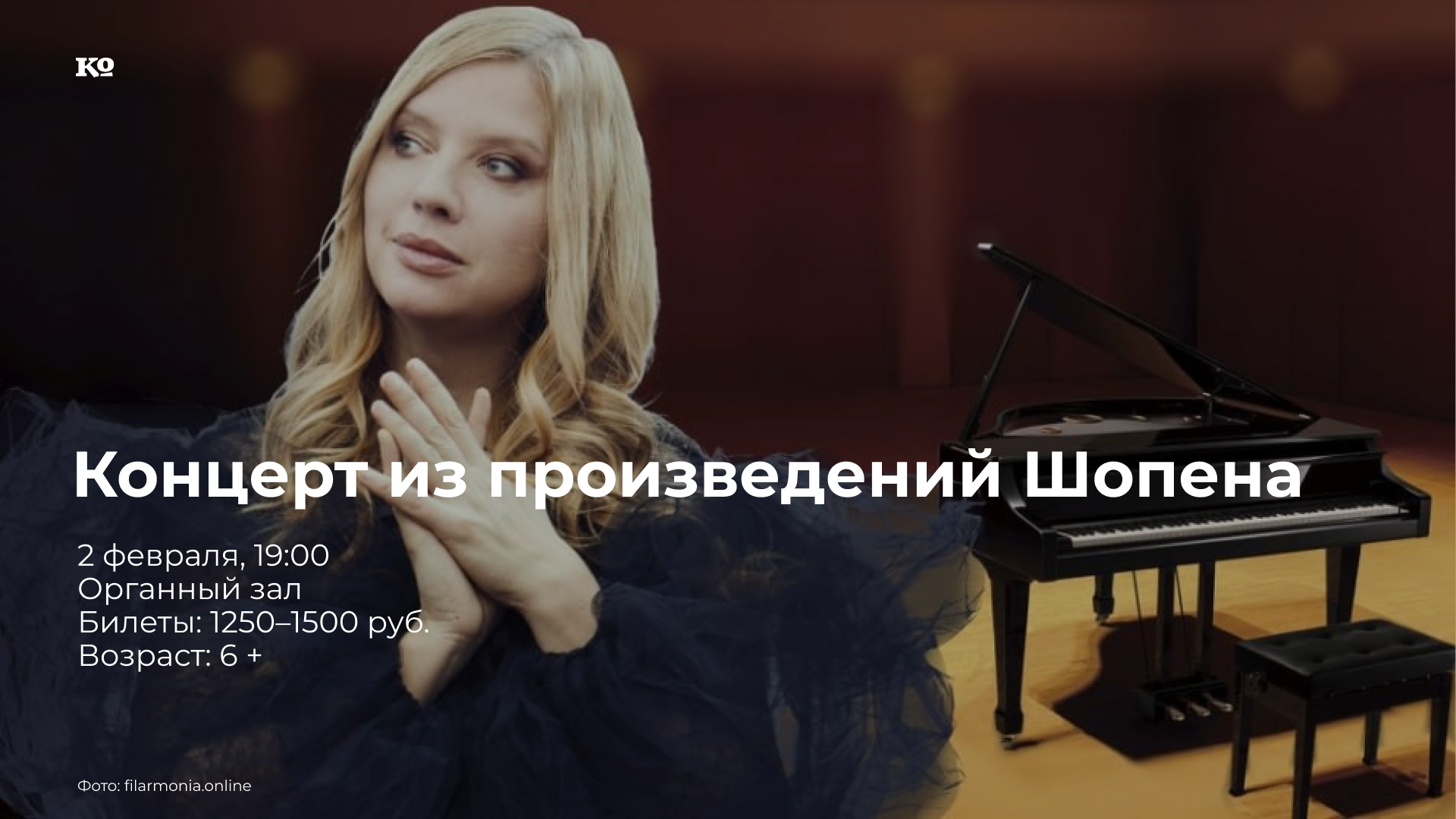 1 марта исполняется 215 лет со дня рождения Фридерика Шопена. Музыка Шопена прозвучит в исполнении пианистки Валентины Лисицы, солистки Москонцерта.В программе концерта — избранные фортепианные сочинения композитора: полонезы, вальсы, ноктюрны, баллады, скерцо, фантазия, а также вариации на тему из оперы Моцарта «Дон Жуан» в переложении для фортепиано. Валентина Лисица — обладательница Первой премии Международного конкурса Dranoff International Two Piano Competition (1991), эксклюзивная пианистка фирмы DECCA с 2012 года.