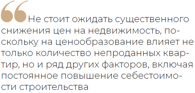 Текущая ситуация способствует постепенному увеличению объёма нераспроданных объектов в проектах, согласен и коммерческий директор АО «ПЗСП» Кирилл Николаев. По его оценке, пока эта тенденция не столь ярко выражена, но уже через год можно ожидать заметное ухудшение динамики. Тем не менее не стоит ожидать существенного снижения цен на недвижимость, поскольку на ценообразование влияет не только количество непроданных квартир, но и ряд других факторов, включая постоянное повышение себестоимости строительства. Рост затрат на материалы и трудовые ресурсы также способствует поддержанию стабильного уровня цен на рынке недвижимости, утверждает эксперт.