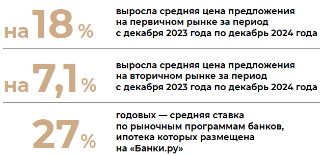 Основным фактором, влияющим на состояние рынка, эксперты единодушно называют уровень ставок. По состоянию на 1 января 2025 года средневзвешенная ставка по ипотечным кредитам достигла отметки 8,47%, и это наименьшее значение за последние полгода, отмечает старший аналитик АО «Свой Банк» Алексей Гусев. При этом средневзвешенная ставка на первичном рынке составляла 6,15%, на вторичном — 12,65%. Однако по стандартным ипотечным программам, то есть за исключением льготных ставок, стоимость кредитов иная. По состоянию на 4 февраля средняя ставка по рыночным программам банков, ипотека которых размещена на «Банки.ру», составляет 27% годовых.