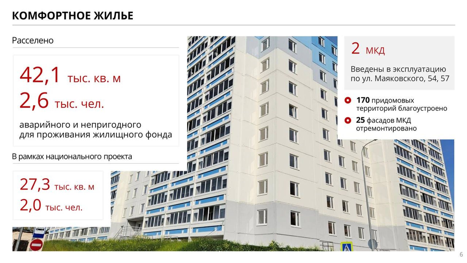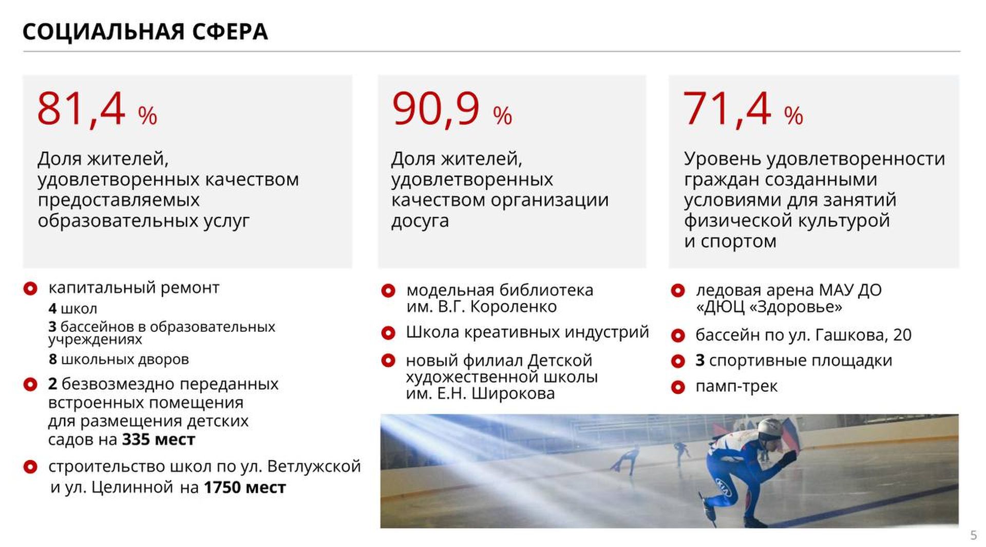 Что касается объектов социальной сферы, в гимназии №2 и школах №44, 118 и 123 завершён капитальный ремонт, по региональному проекту «Комфортный край» благоустроены пришкольные территории восьми школ. В разных районах города введены в эксплуатацию современные спортивные объекты, такие как бассейн на ул. Гашкова и ледовая арена «Прикамье» на ул. Ласьвинской.
