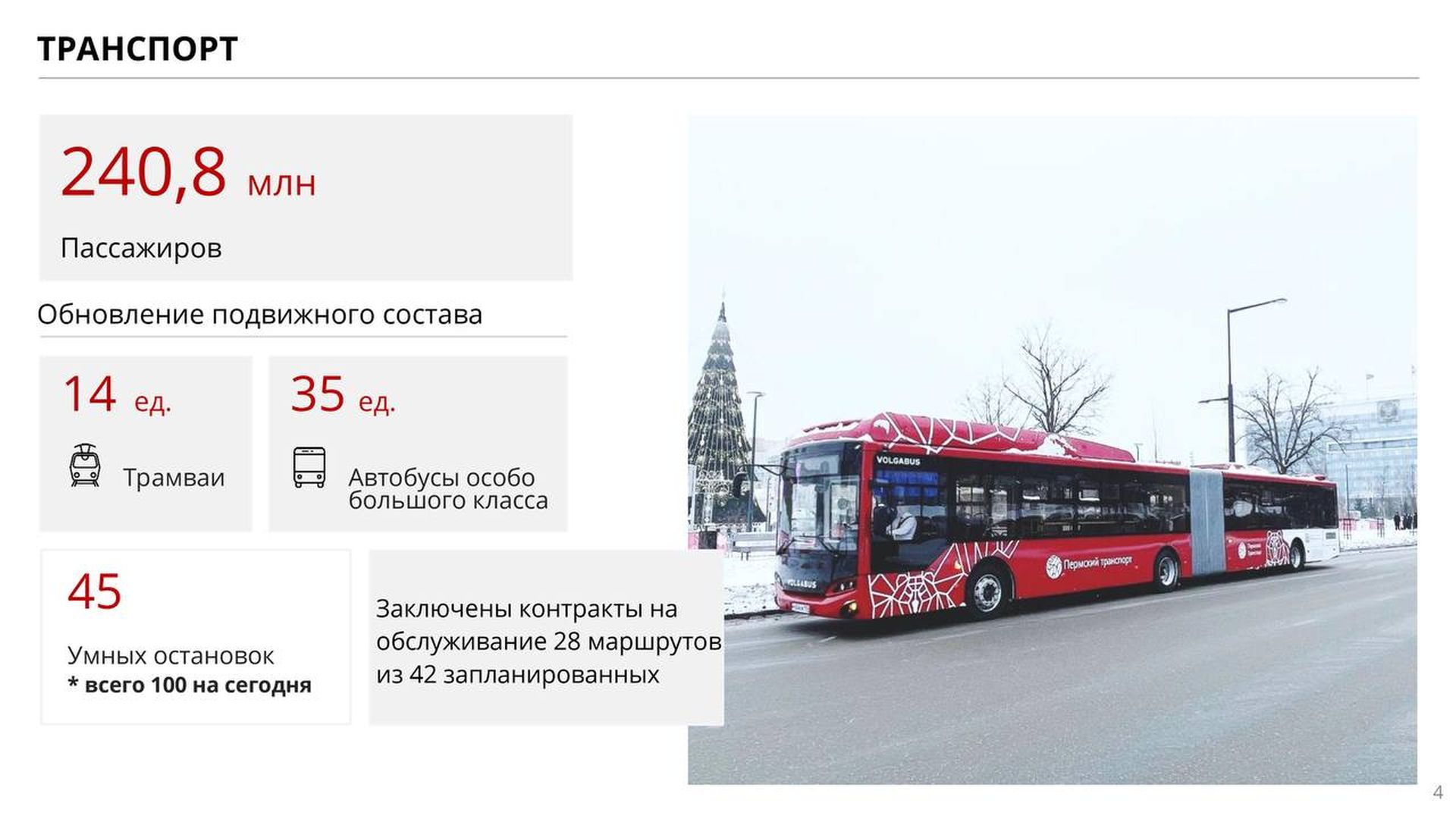 Для развития транспортной отрасли в 2024 году было приобретено 14 новых трамваев и 35 автобусов особо большого класса, установлено 45 «умных» остановок — их общее количество достигло 100. В целом общественным транспортом в прошлом году воспользовались более 240 млн пассажиров — на 3% больше, чем годом ранее.