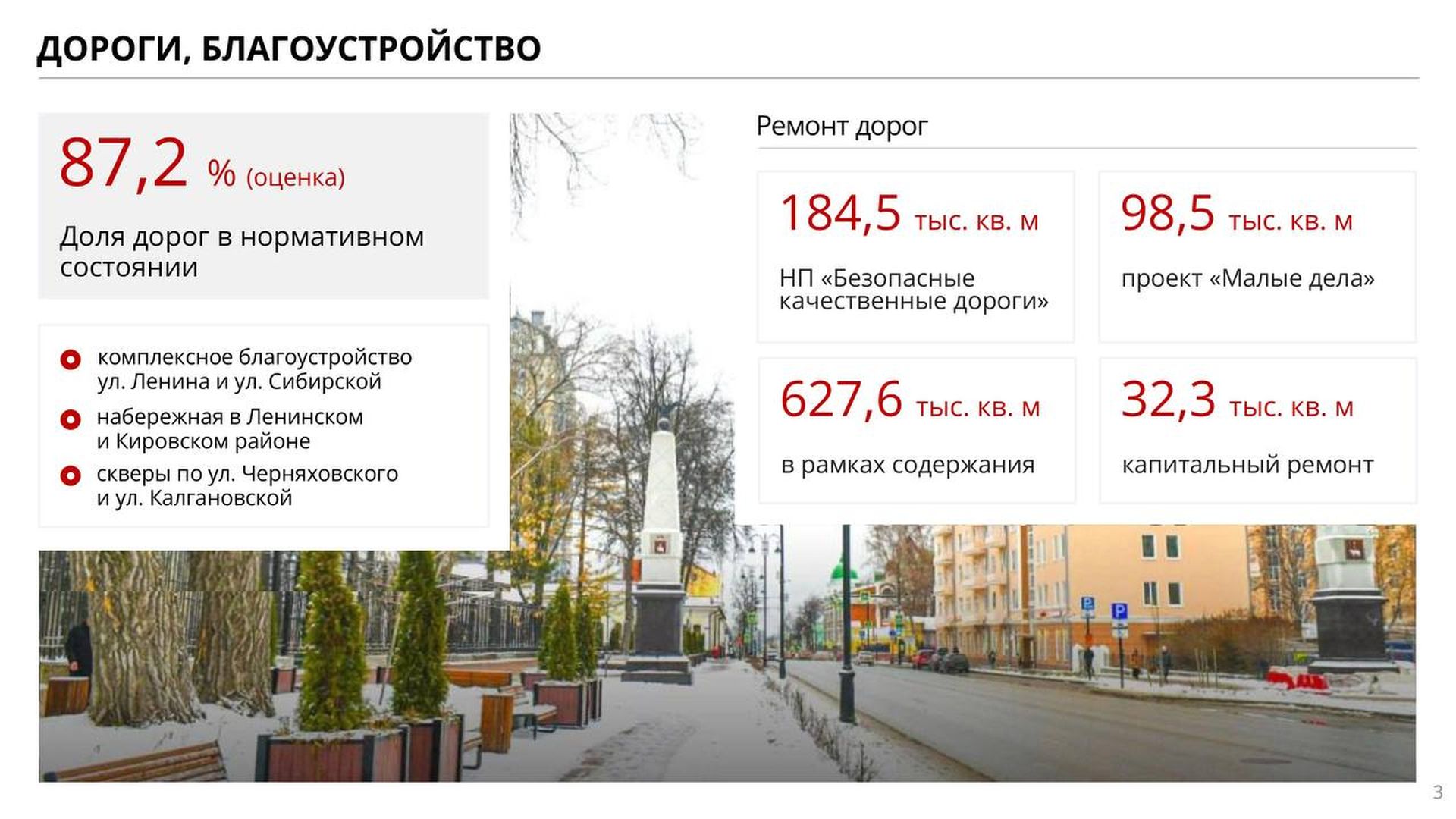 Так, в прошлом году завершено комплексное благоустройство центральных улиц Перми — Ленина и Сибирской. На улицах Калгановской и Генерала Черняховского появились новые скверы, открылась обновлённая набережная в Кировском районе, на нижней части набережной в Ленинском районе отремонтирован сквер и стартовал этап по обустройству нового участка.