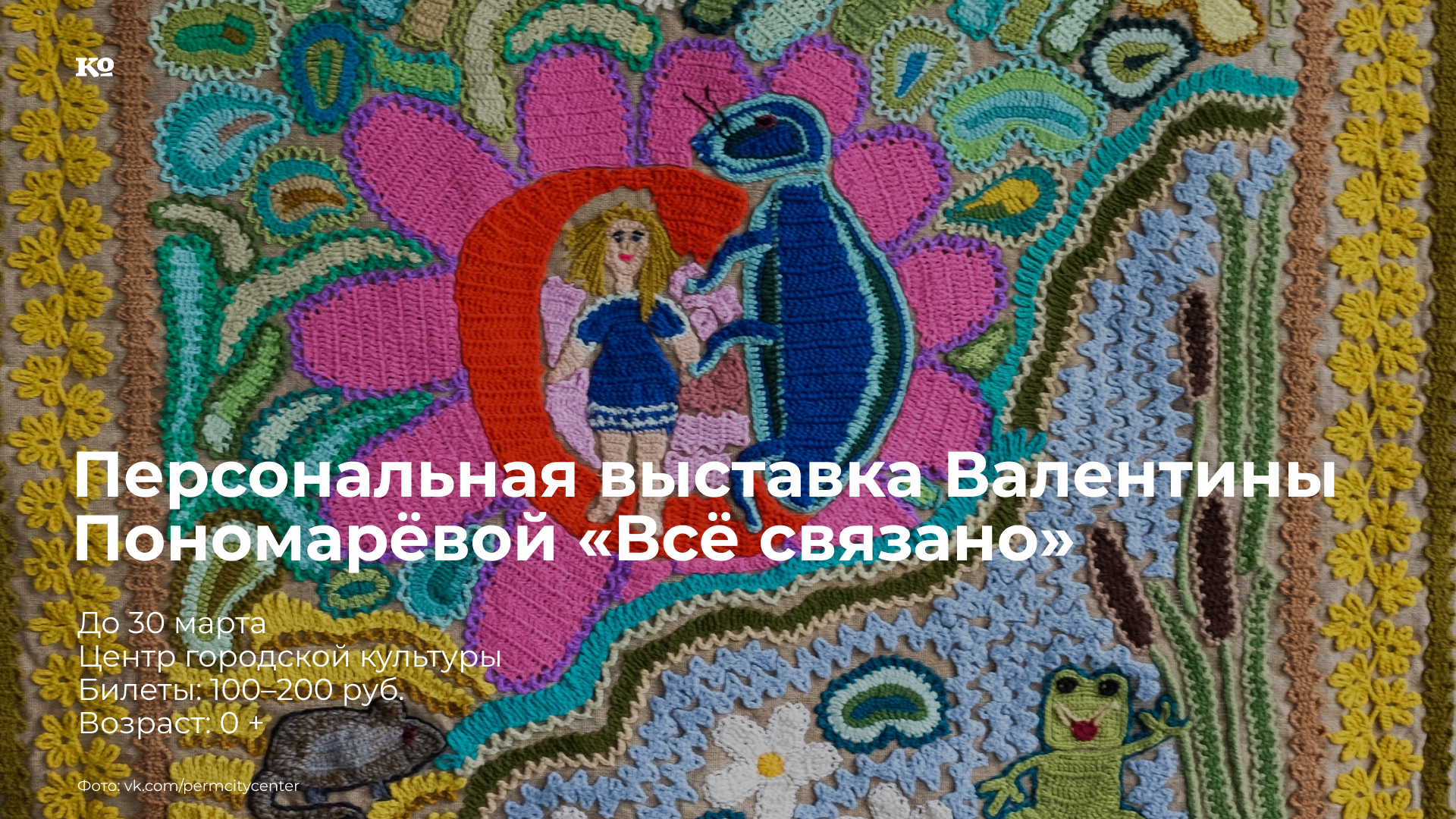 «Всё связано» — выставка про связь поколений и про то, как эта связь поддерживается. Валентина Пономарёва — создательница сказочных панно в авторской технике «кружевной аппликации» и автор многочисленных стихов. Её работы находятся в коллекции пермского музея советского наива, Пермской художественной галереи, музея наивного искусства (Екатеринбург) и в частных коллекциях. На создание каждого панно уходит несколько месяцев кропотливой ежедневной работы. Сюжеты Валентина Тимофеевна выбирает, «как настроение подскажет», и до сих пор оно подсказывало в основном сценки из сказок и народных песен.